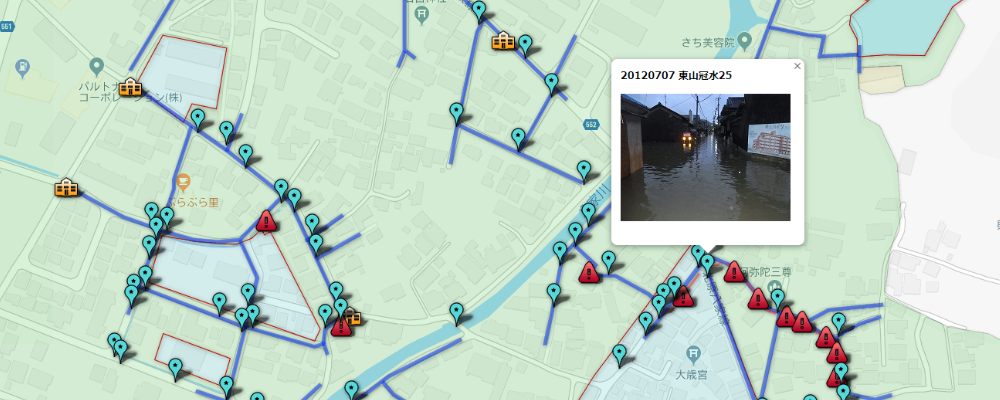 ③ 2012年7月の大雨時の東山地区の冠水の様子を画像付きで見ることが出来ます。 また、2011年台風12号の被害状況も併記しています。