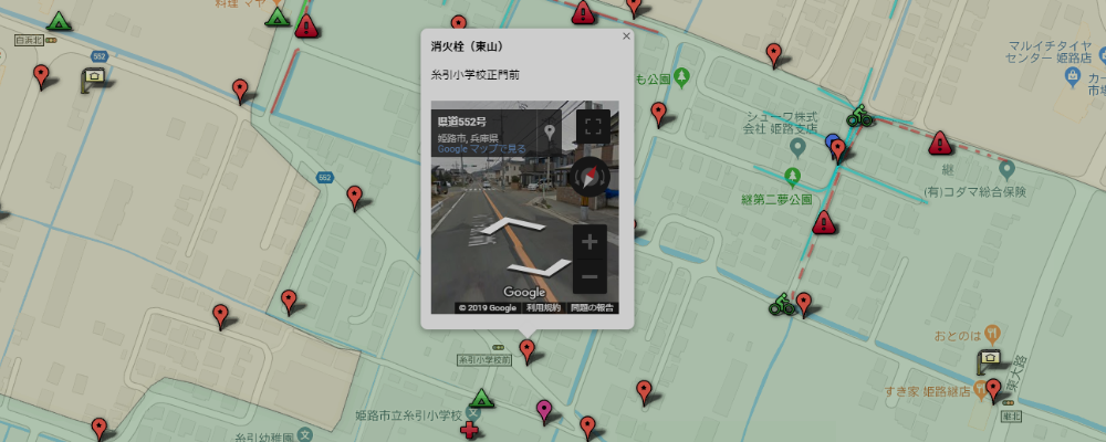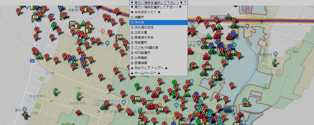 ① 見たい項目をチェックボックスで選択して表示出来ますので、消防団員だけでなく、一般住民の方も判りやすいと思います。また、検索ボックスにご自宅の住所を入力すれば、ご近所の危険箇所も判ります。