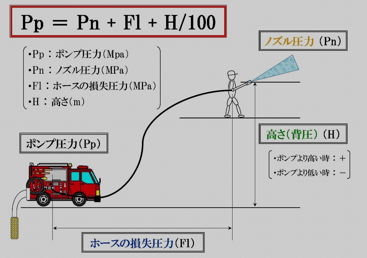 ポンプ車の操作要領については、これまで 「ポンプ車操作要領」 や 「可搬式ポンプ操作要領」 で説明してきました。今回は、実際に消火に必要な放水量を得るための圧力設定について、説明したいと思います。
