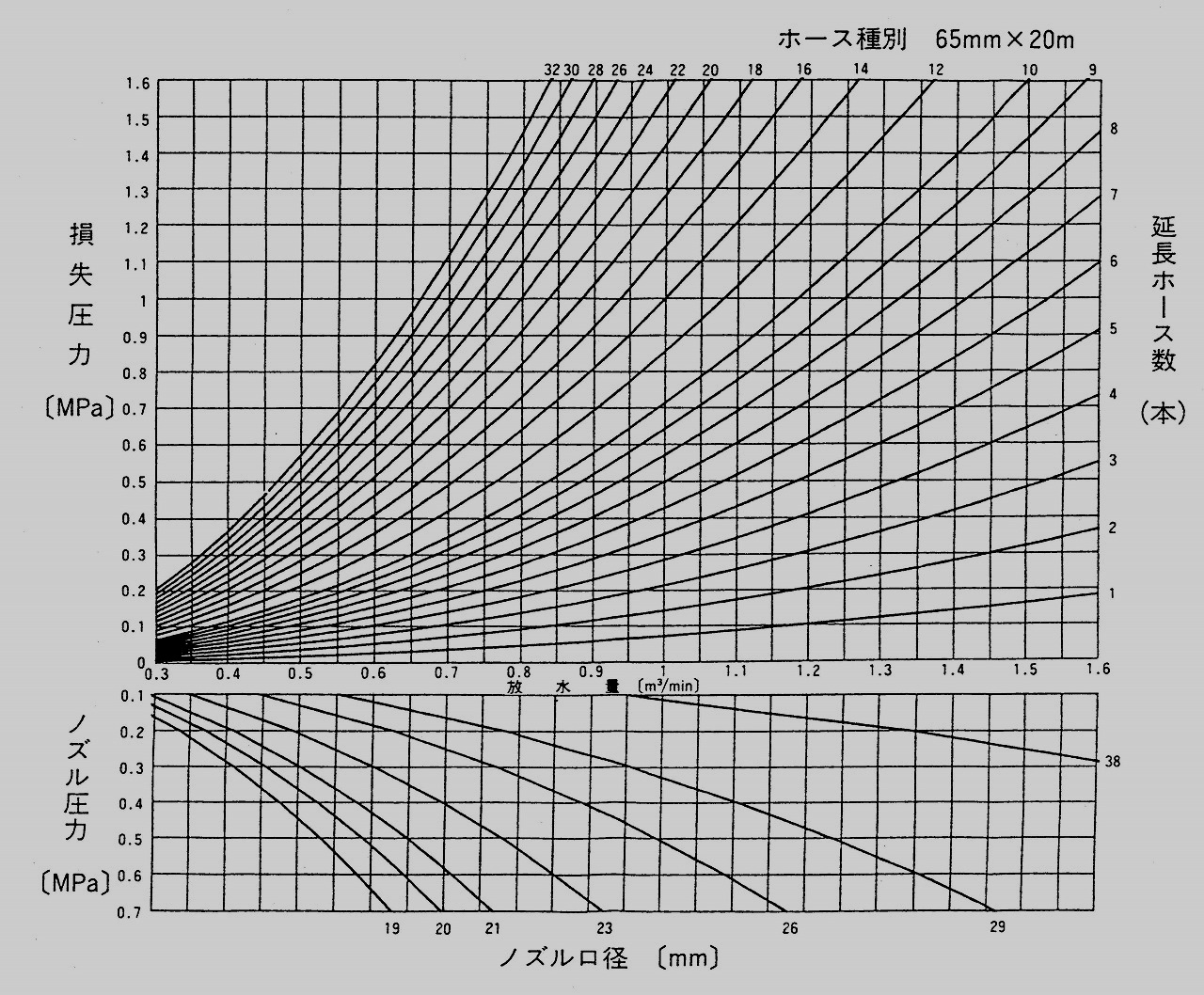 消防士は「送水基準板」という ホースの放水量に対する損失圧力とノズル圧力をまとめたグラフ を利用しているそうですが、これが中々読みづらく、計算するのも嫌になってしまいます。(最新車種に搭載されているポンプの操作パネルには、放水量、反動力の他、送水圧力の上限… etc.も設定出来るので「送水基準板」は必要ない? のかも…)株式会社モリタ eモニタ