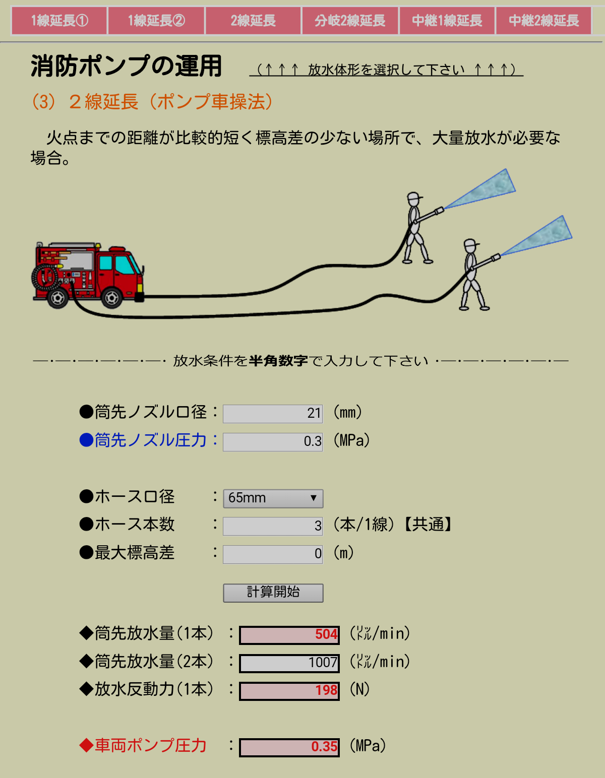 現場で取る代表的な放水体形ごとに、条件さえ入力してやれば、「筒先ノズル圧力」や「筒先反動力」、水利元および中継車両の「送水圧力」や「放水量」を求めることが出来ます。