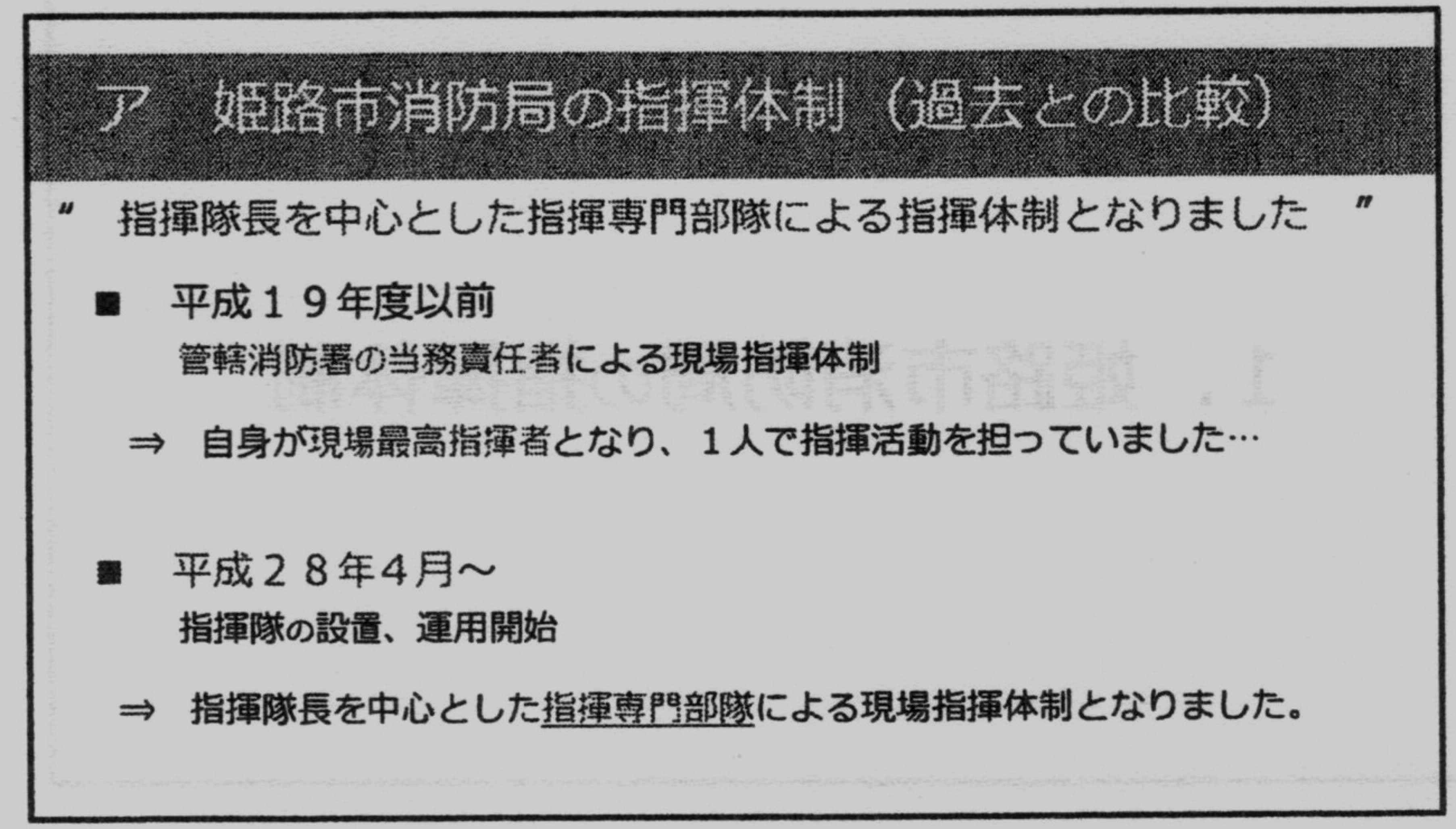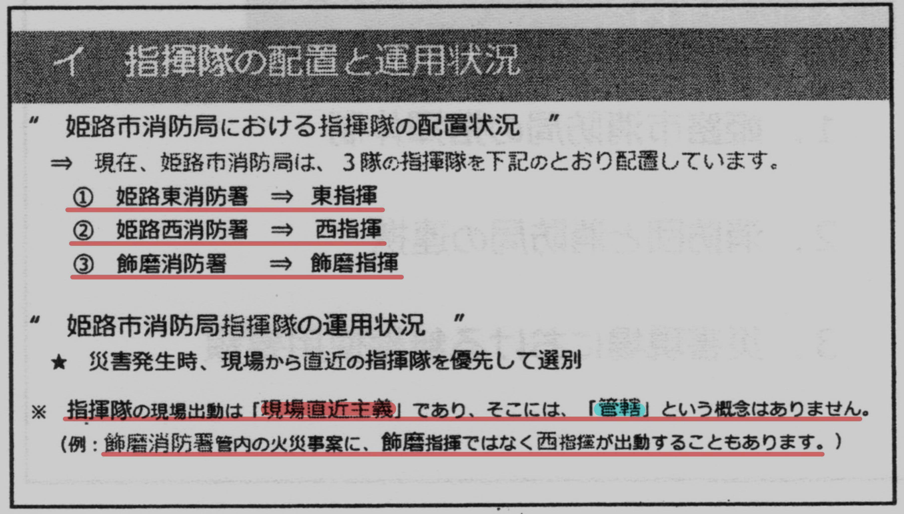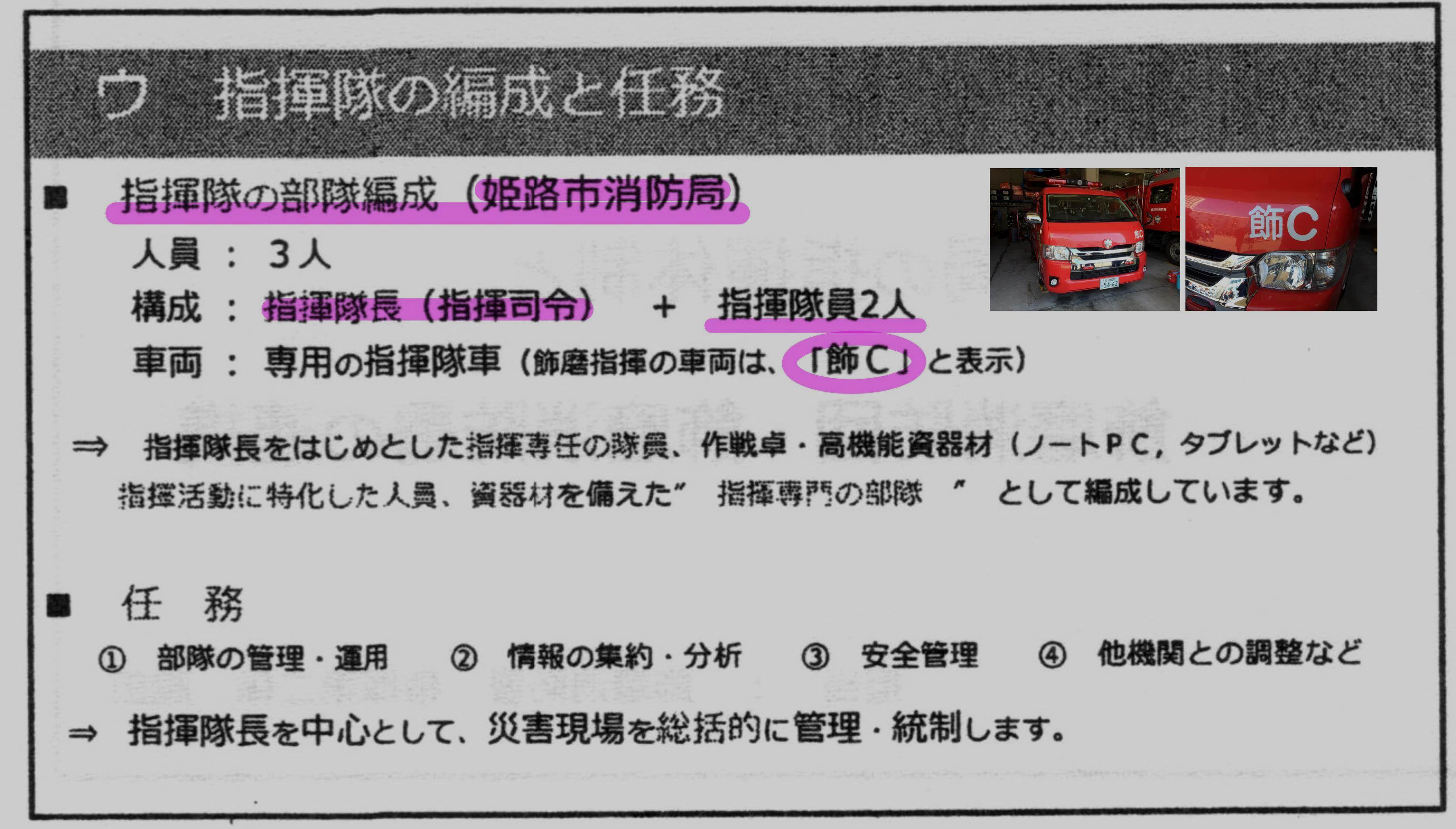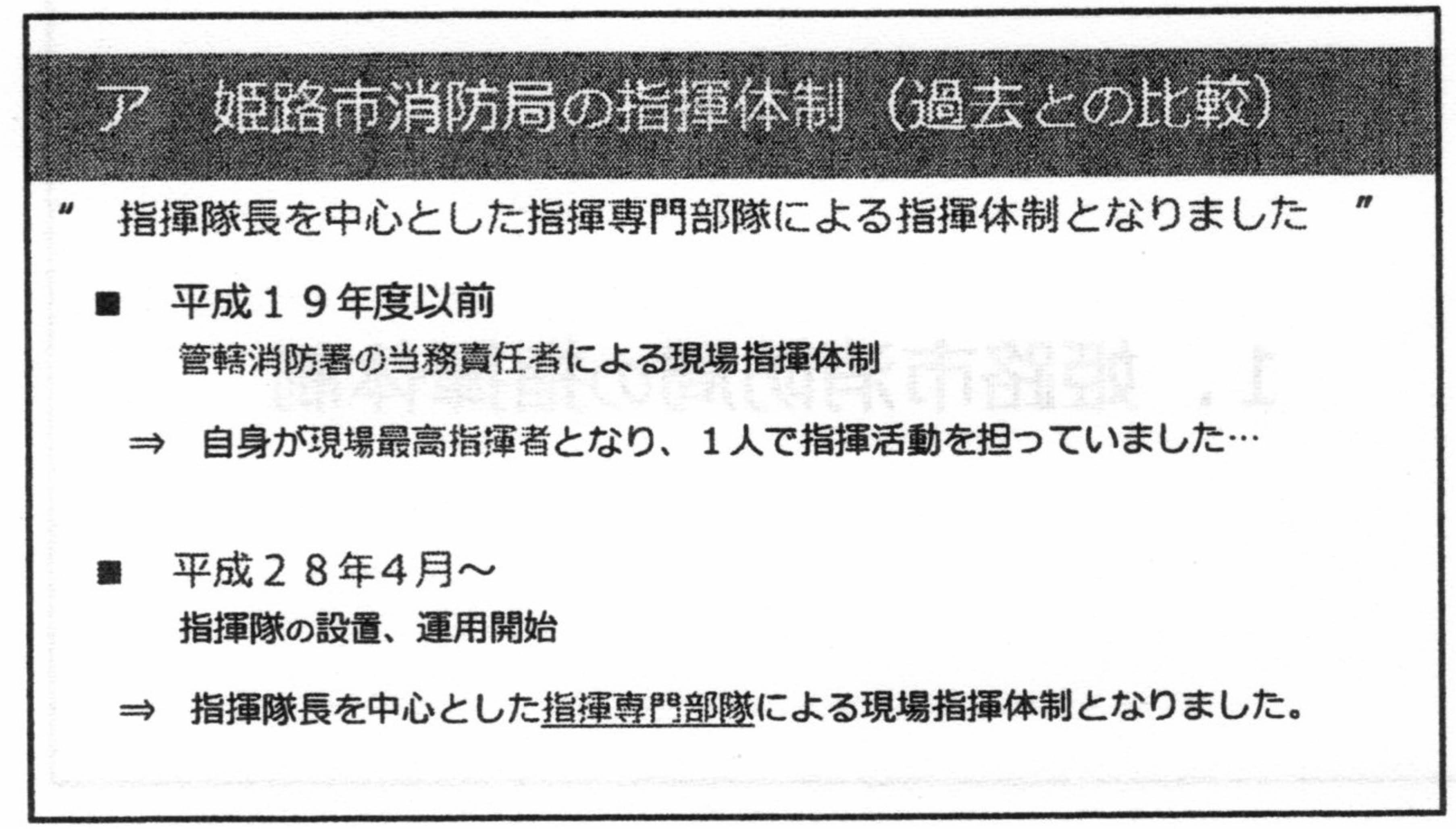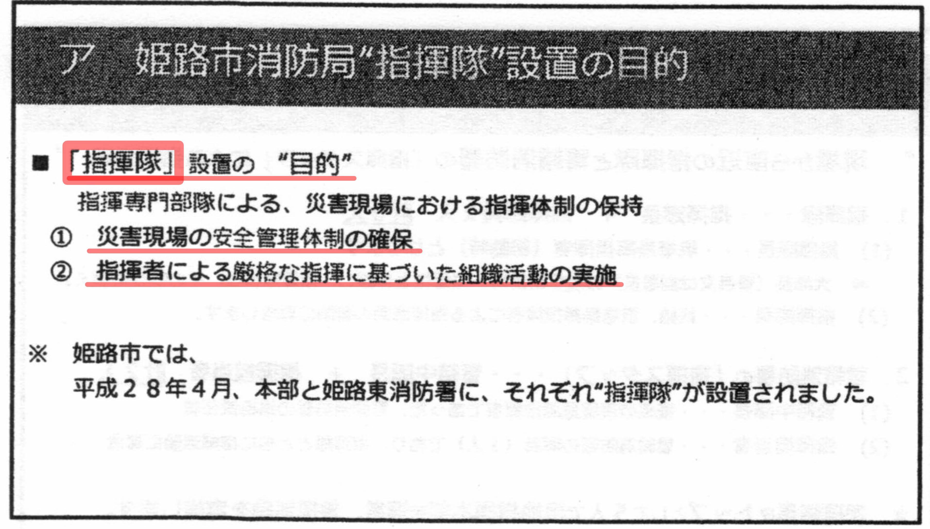 - 姫路市では、2016年4月から災害現場の安全管理体制を確保するため「指揮隊」が設置され、指揮隊長を中心とした指揮専門部隊による現場指揮体制となっています。(姫路東指揮、姫路西指揮、飾磨指揮)