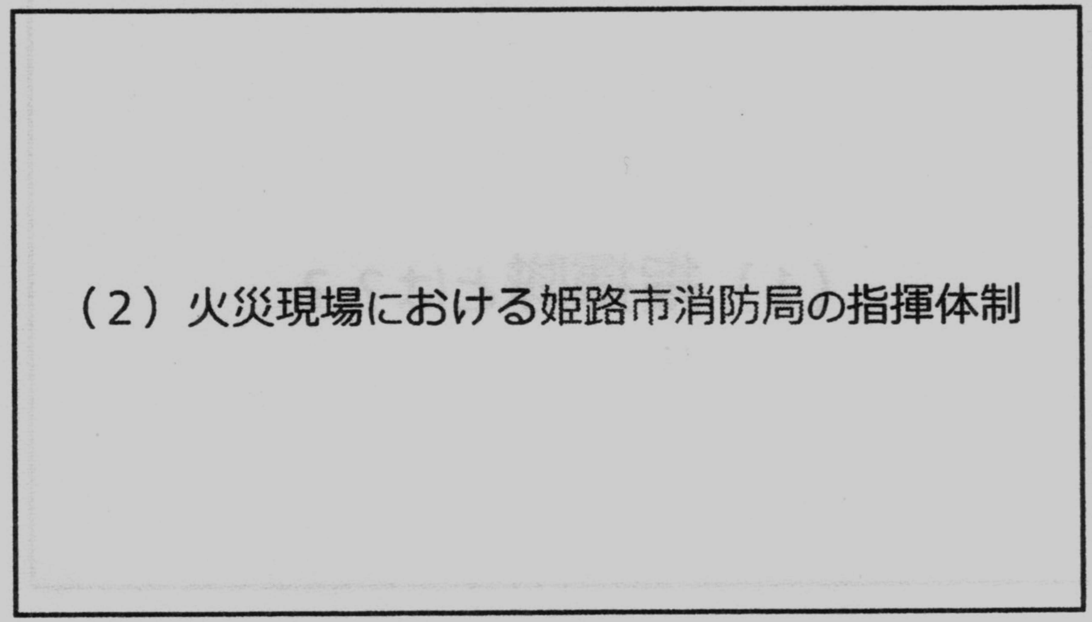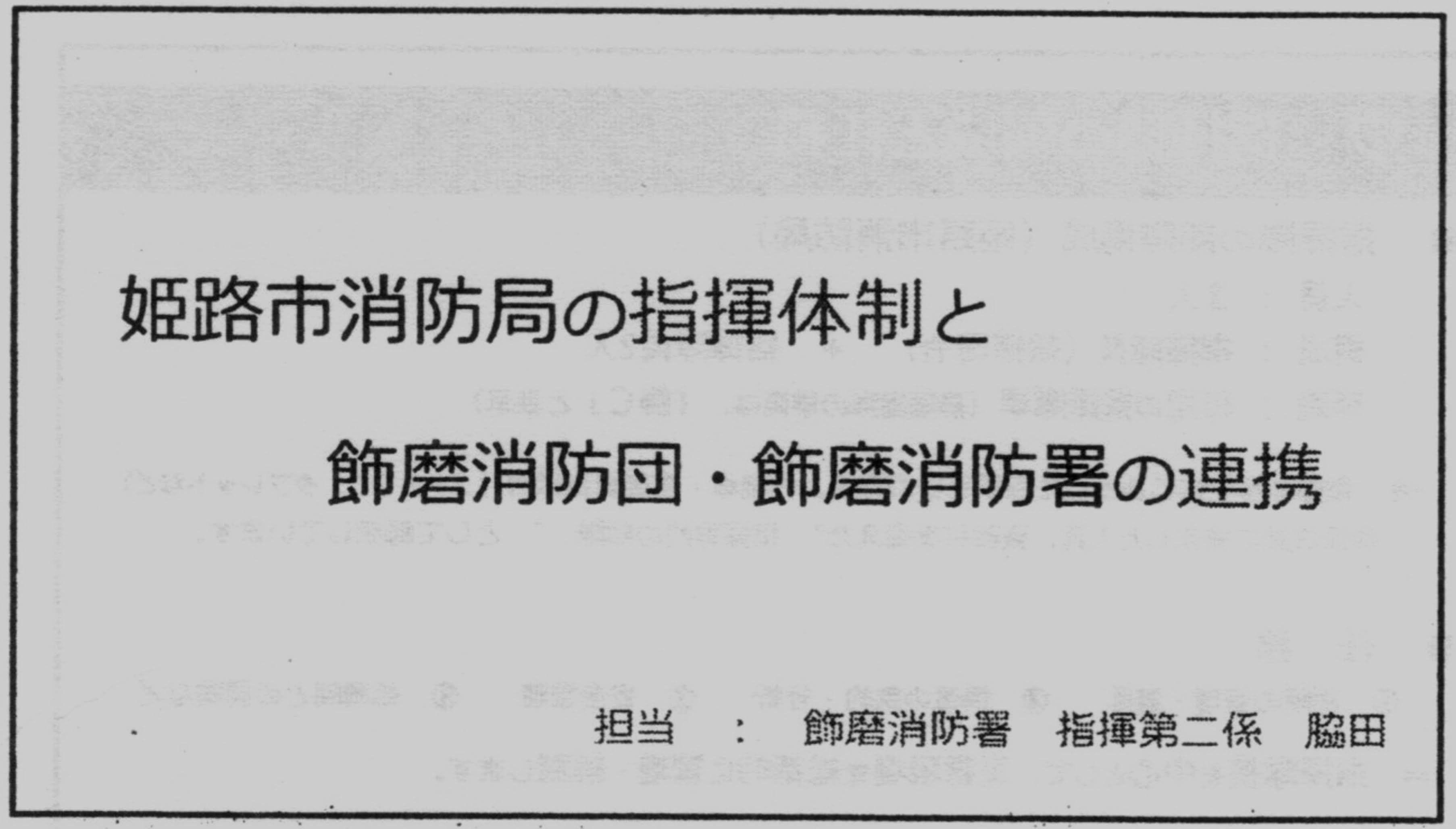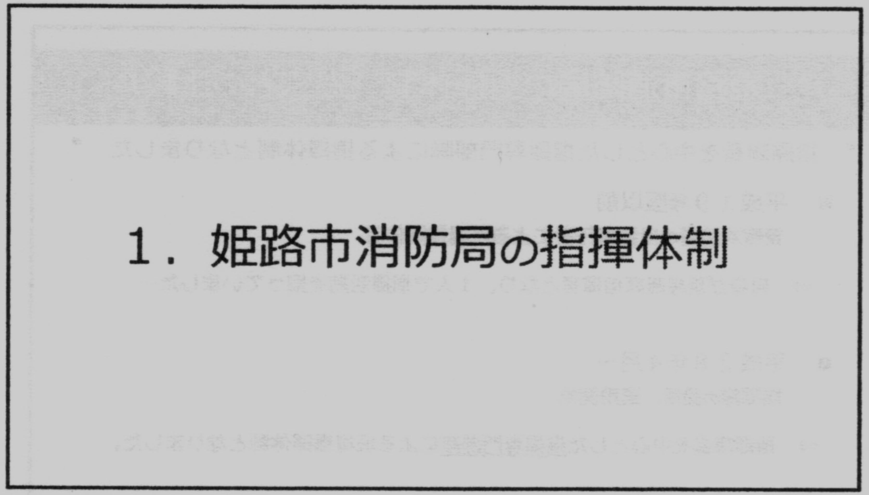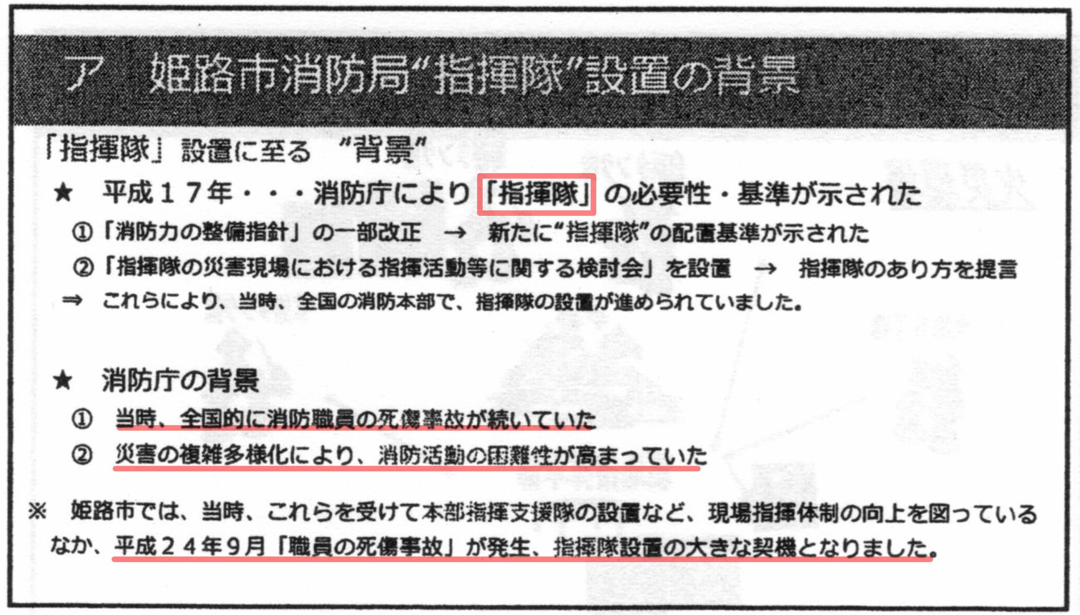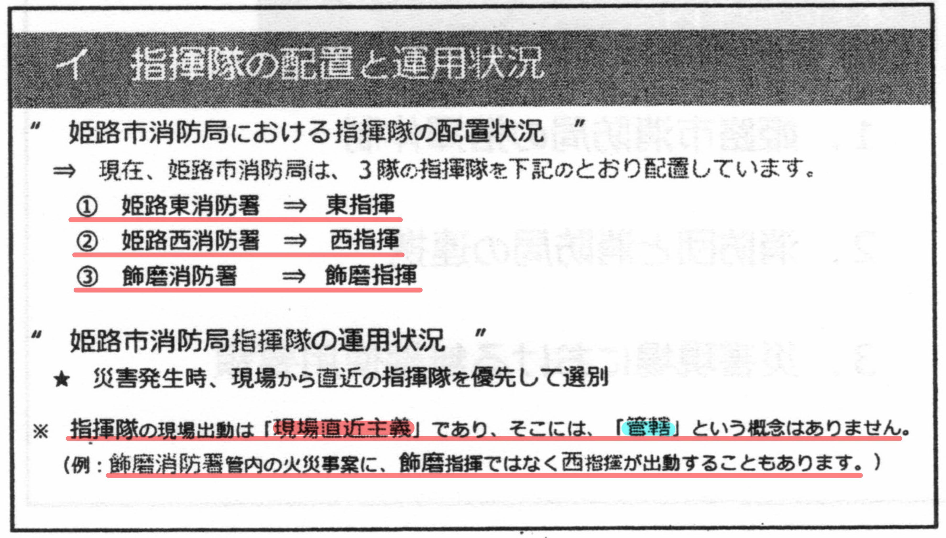 - 姫路市では、2016年4月から災害現場の安全管理体制を確保するため「指揮隊」が設置され、指揮隊長を中心とした指揮専門部隊による現場指揮体制となっています。(姫路東指揮、姫路西指揮、飾磨指揮)