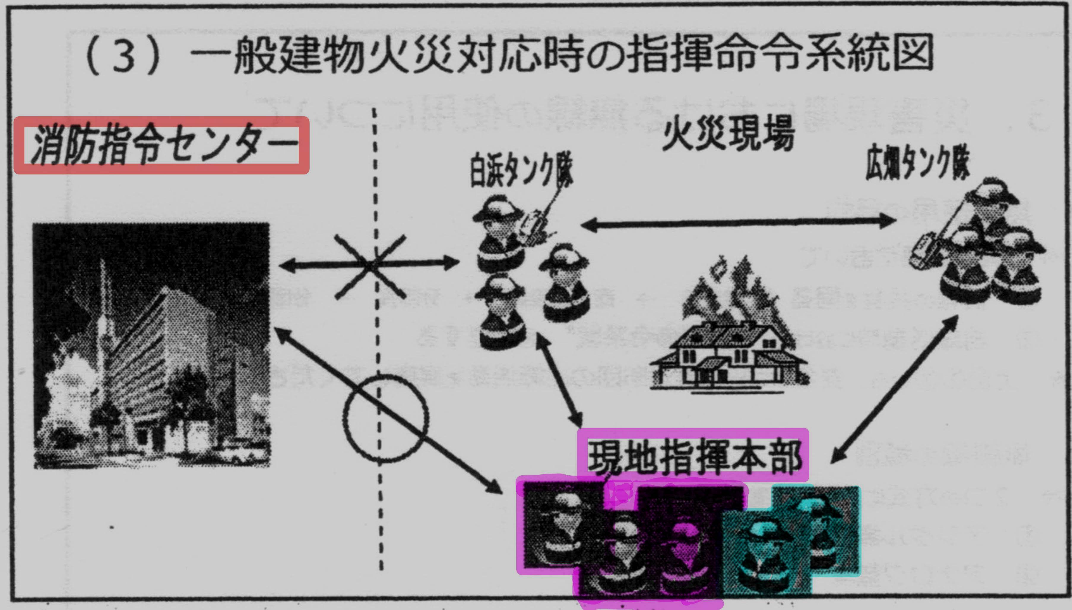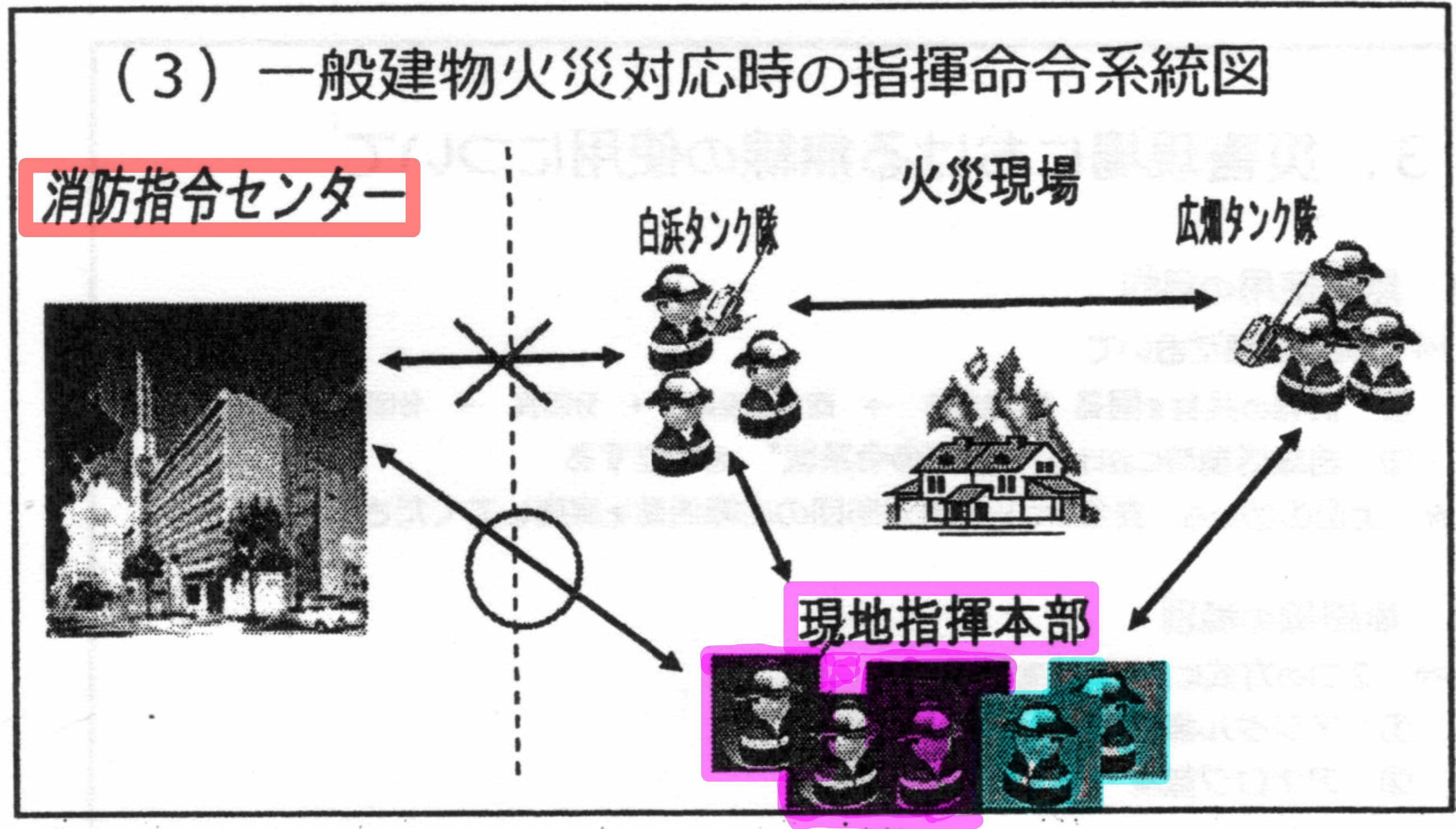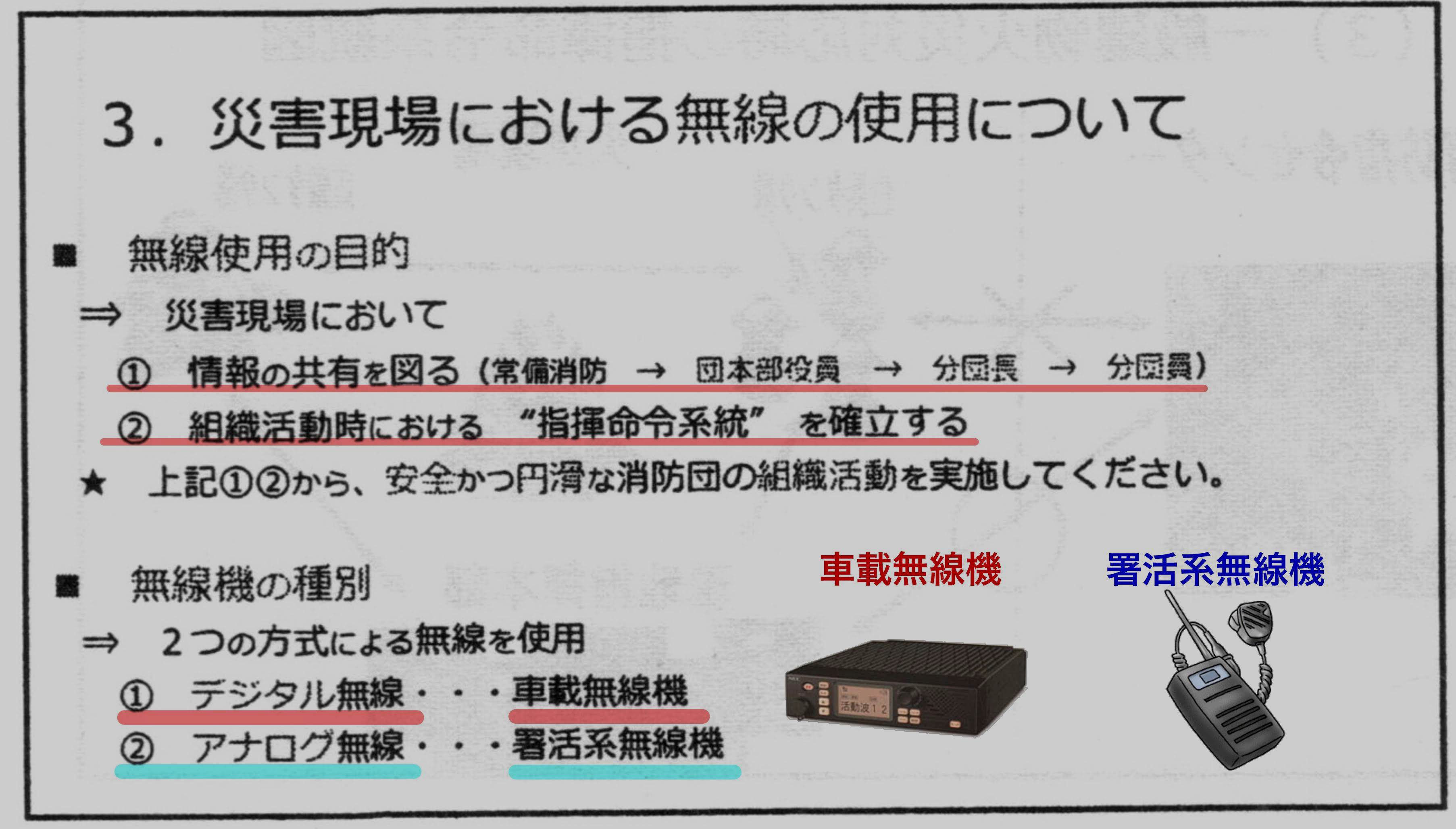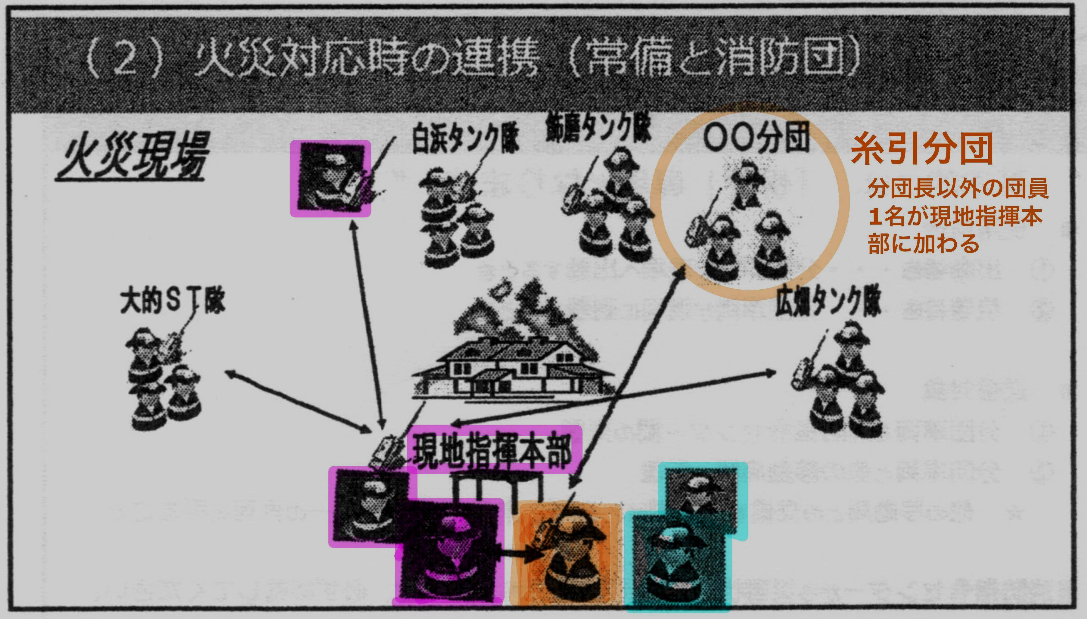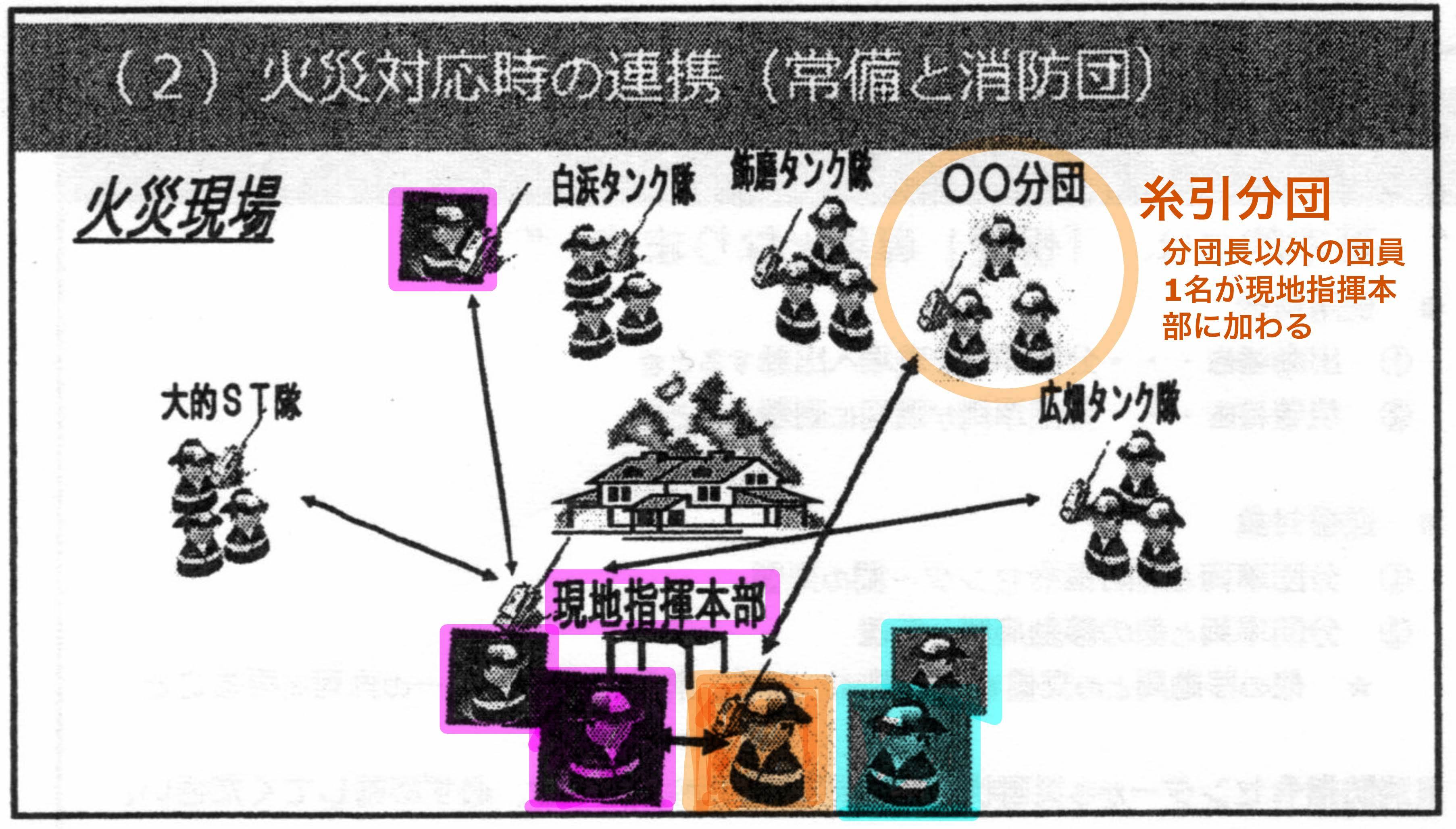 - 火災時には分団からも分団員1名が「現地指揮本部」に入り、指揮隊長からの指示を分団長あるいは機関員等に無線連絡して情報の共有を図ります。