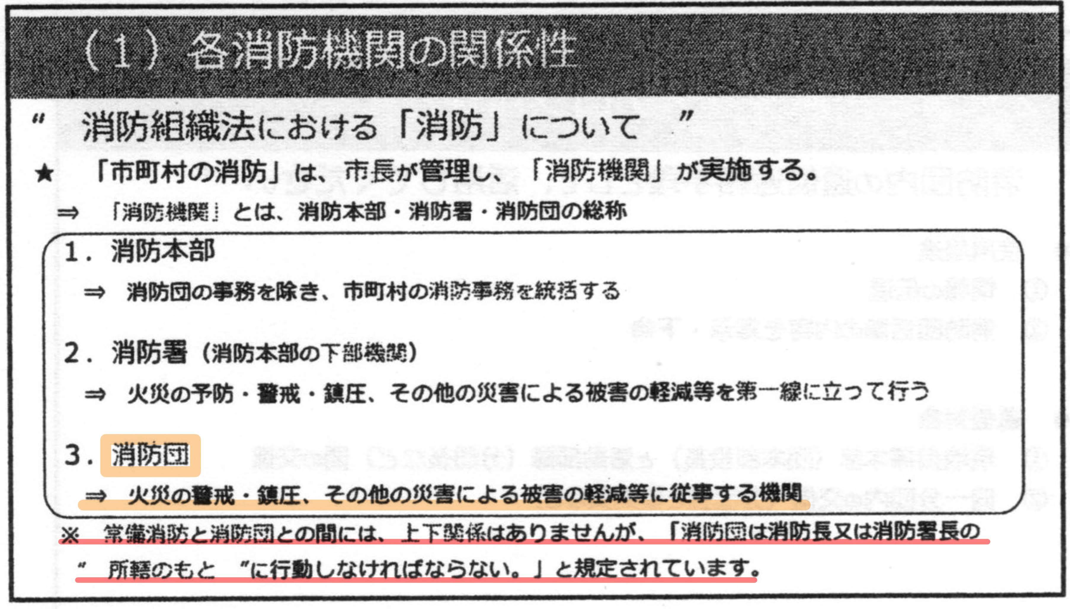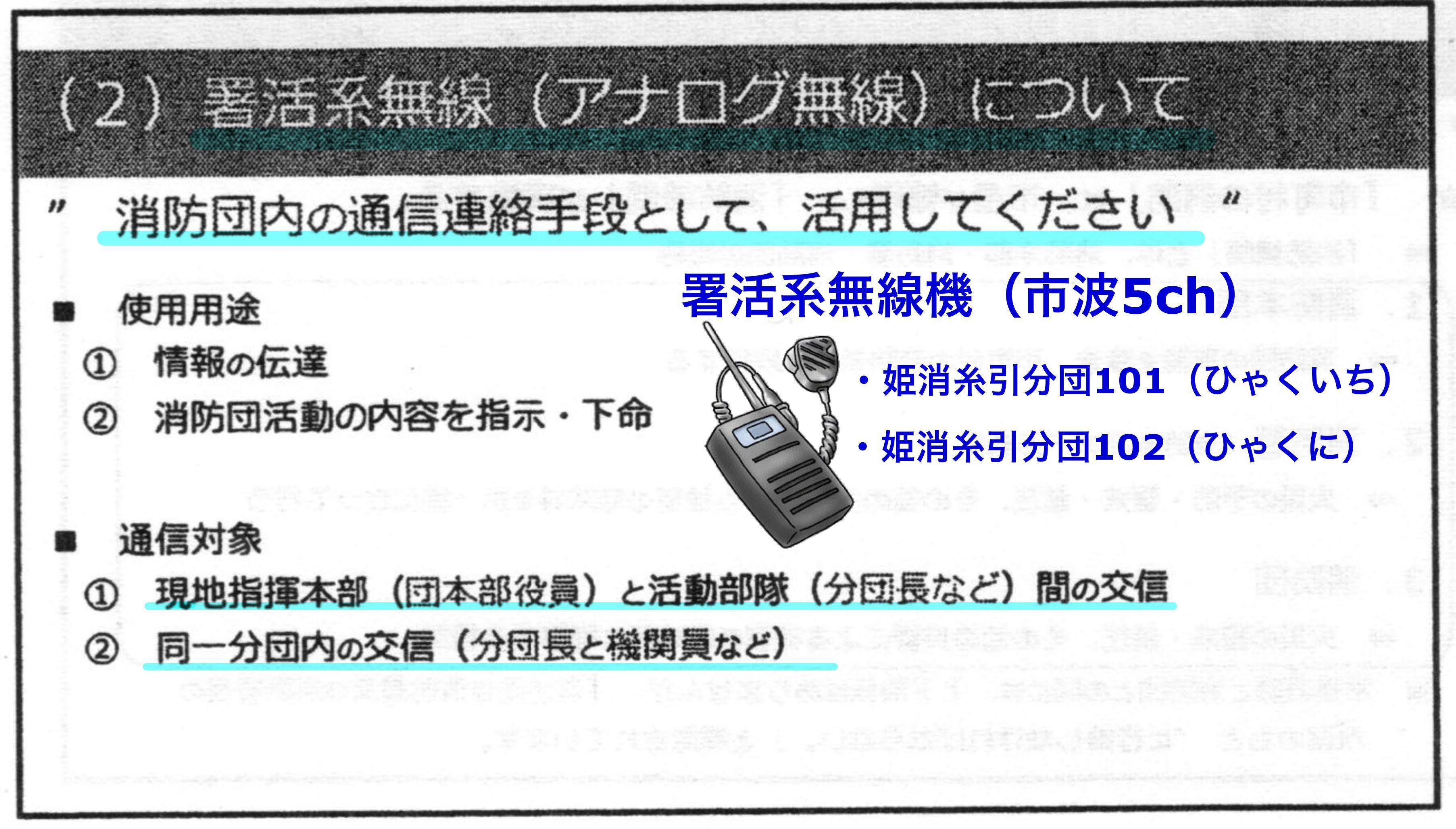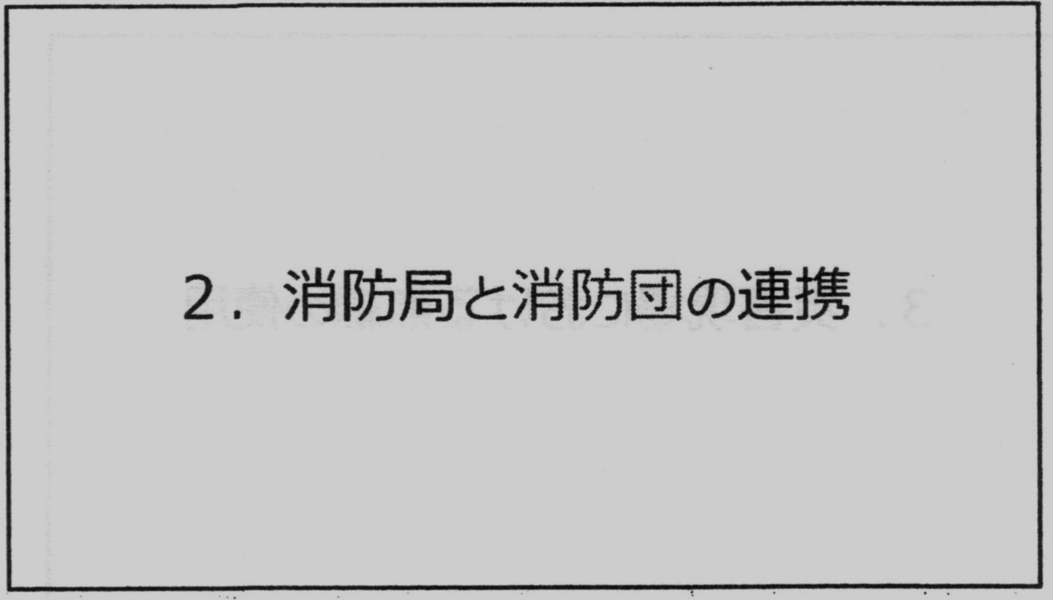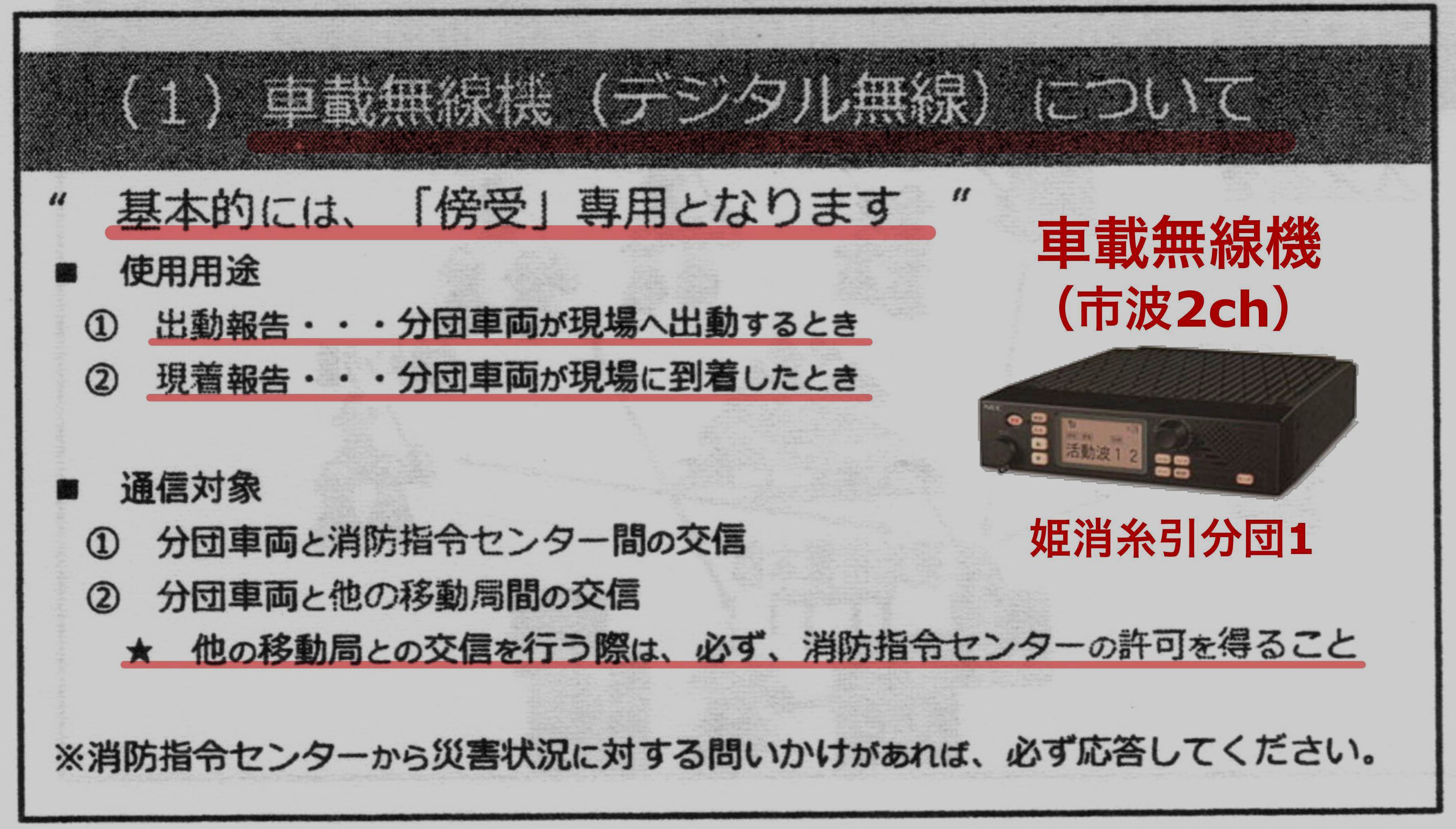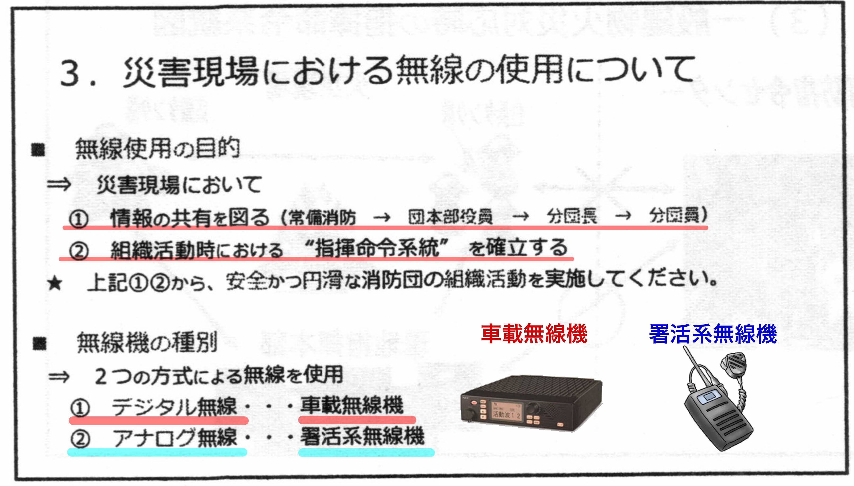 - 火災時には分団からも分団員1名が「現地指揮本部」に入り、指揮隊長からの指示を分団長あるいは機関員等に無線連絡して情報の共有を図ります。